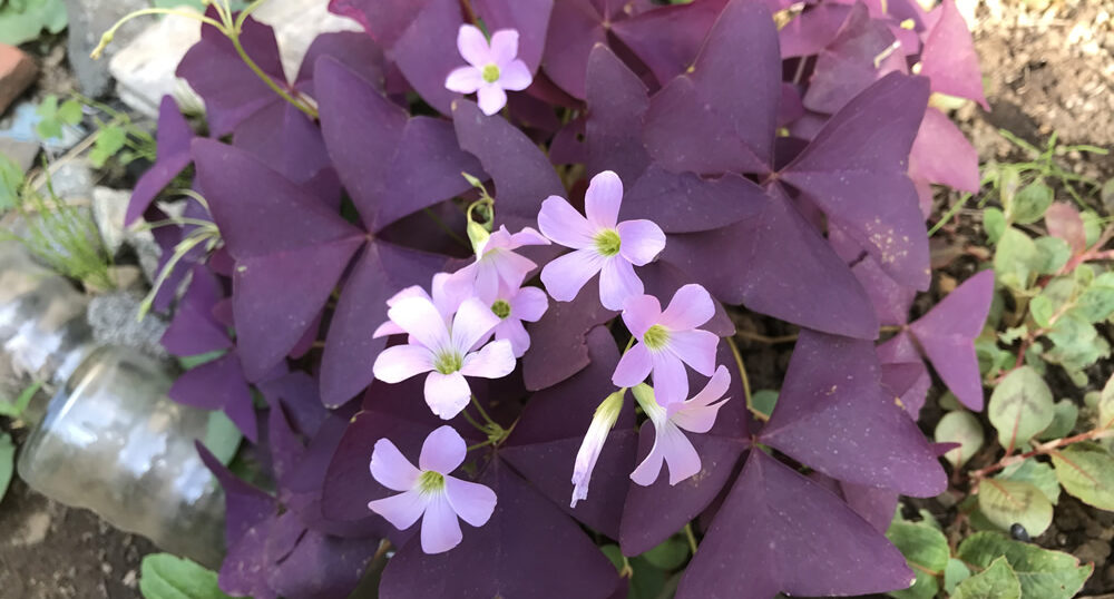 これはお店で苗を買ったものですが、道端に生えているカタバミと同じカタバミ科です。カタバミはグリーンの葉に黄色の花。ハートの葉がかわいい。雑草として生えていても、ついついそのままにしてしまいますね。