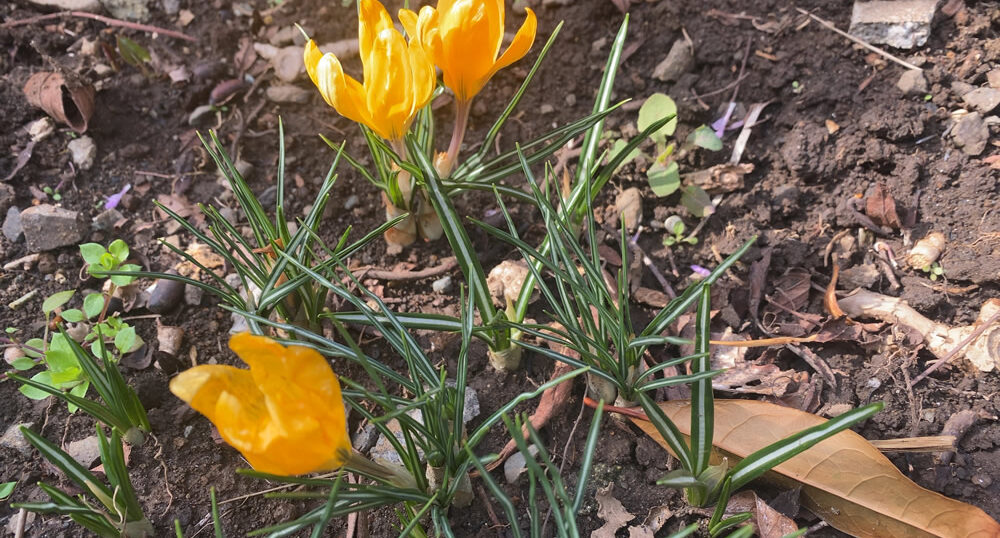 去年の秋に植えたクロッカス。ざっくり空いてるところに植えてみたやつ。紫と黄色。紫はこれから出てくるかな?