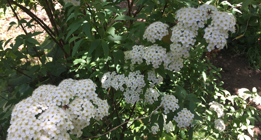 たぶん母が植えたコデマリ。毎年いつの間にか裏庭の木の下でひっそりと咲いています。