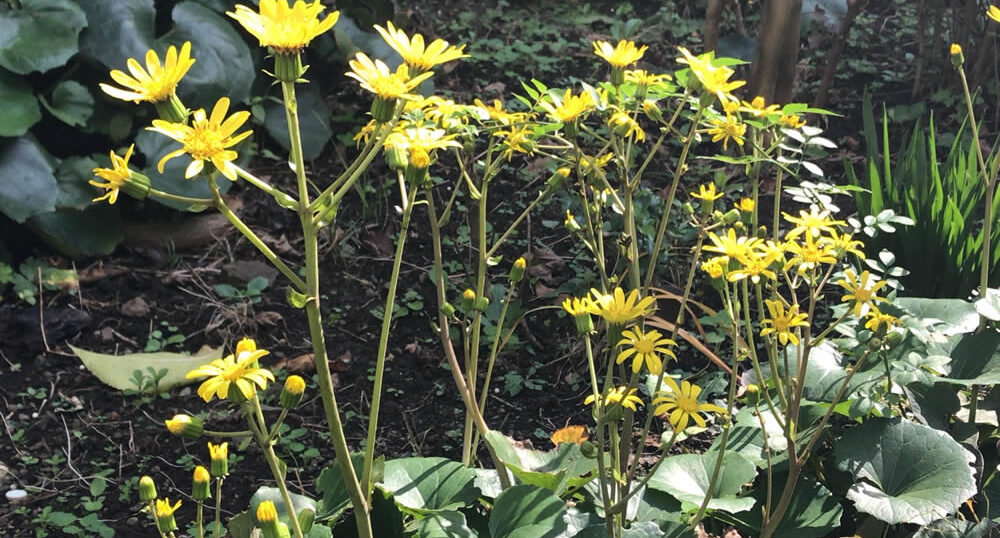 ツワブキ。秋になると庭が一面黄色になります。葉っぱはフキの葉に似ていますが艶があります。艶のあるフキだから「ツワブキ」の名になったと聞いたことがあります。