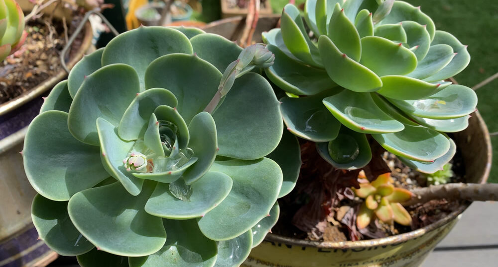 多肉の七福神、置いている場所でかなり大きさに差が出た。倉庫の上に置いたのはヒョロヒョロに伸びてしまったからなんとかしなくちゃなぁ。
