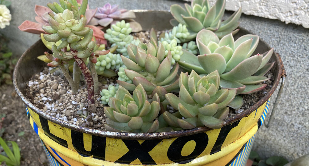 オイル缶リサイクルのプランターを購入。ジャンクな感じがすてき。その一つに多肉を寄せ植えした。これは玄関側に。もう一つはアガペを植えて裏庭に。