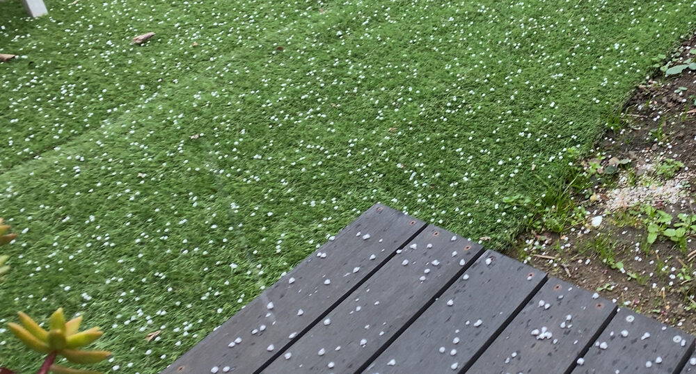 大きいふわふわのボールみたいな霰が降ってきた。ほんの数分で人工芝にツブツブがいっぱい!おもしろい。