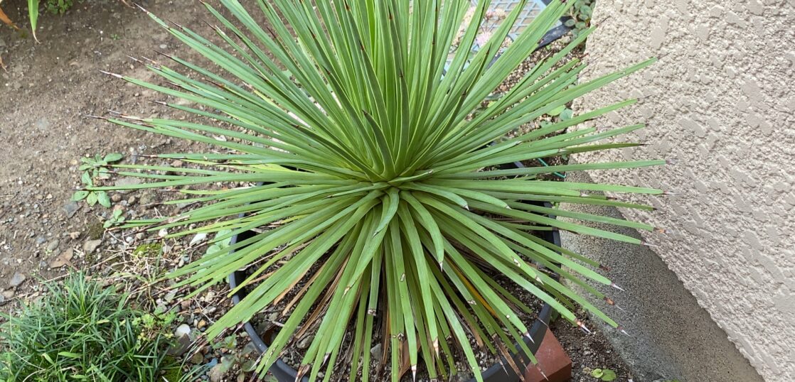 トゲトゲの葉は刺さると危険!…でも玄関先に置いてる。一度植え替えて鉢もかなり巨大になってなかなか動かす気にもならず。真冬も雪の時だけ除けてやってそのまま越冬。この場所も気に入ってるみたいで、家の主のようになってきた。