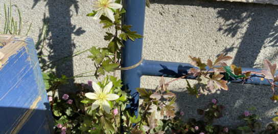 去年買ってきた変わったクレマチス。垂れ下がる枝に小さい花が沢山咲きます。 先のことを考えて地植えにした。鉢だと冬に枯れてしまいそうな気がして。枝を這わせてるのは