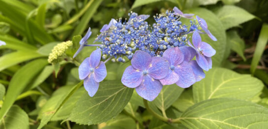 裏庭のアジサイ。冬に強剪定したからか、今咲いているのは一株だけ。ちょっと切りすぎたかなぁ?ちなみに短くなったアジサイの後ろには隣家のキュウリがぐんぐん成長中。み