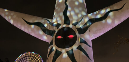 8時過ぎのGENKiPARK終了後の太陽の塔。通常この時間は閉園しているのでこれが見られるのは貴重とのこと。 背面の「黒い太陽」は赤い目にゆらゆらライティングで